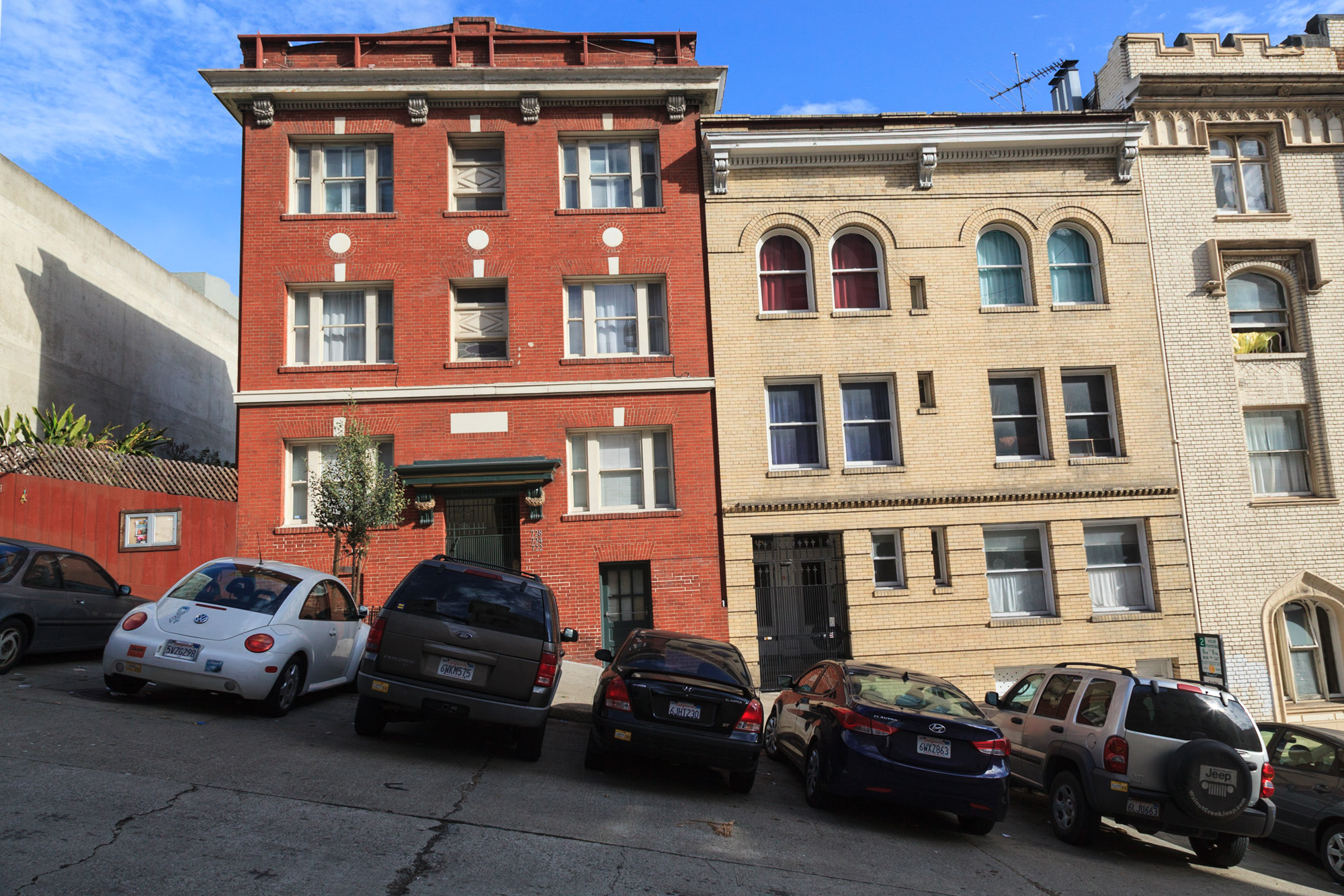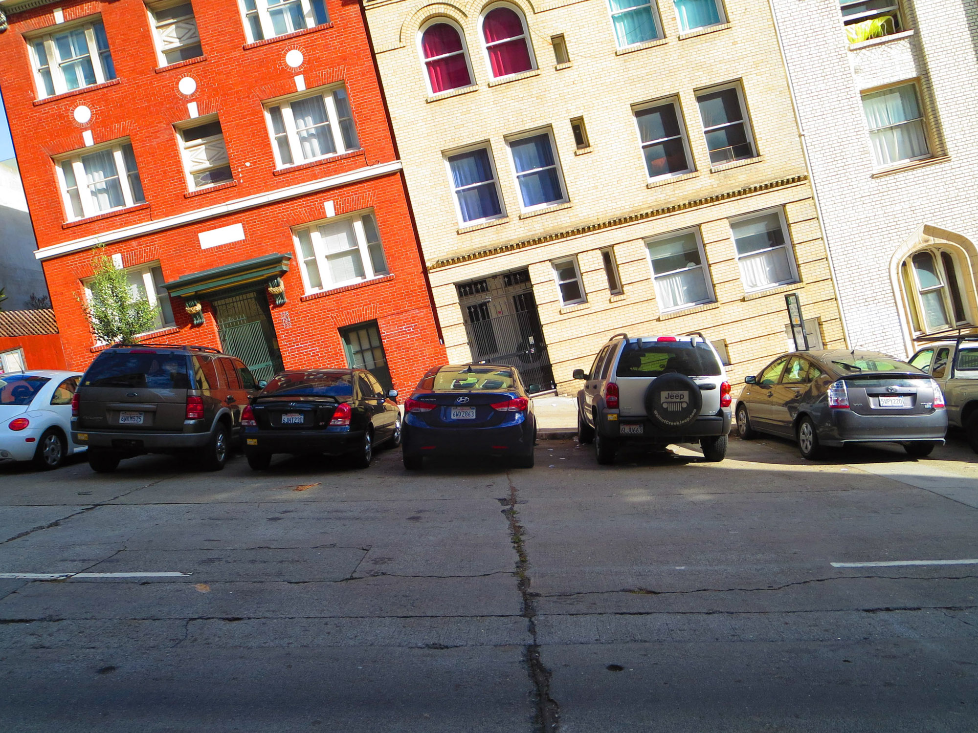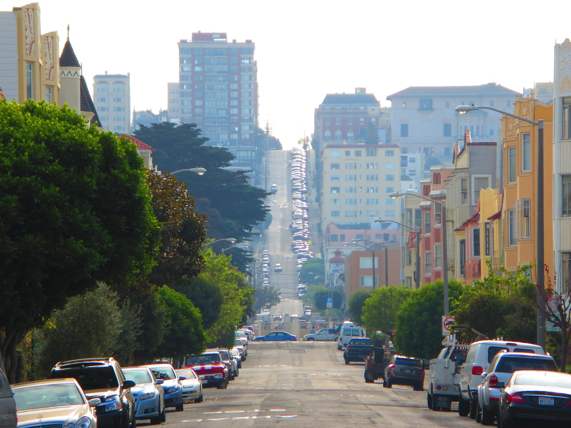 C’est en gagnant notre hôtel du centre ville avec nos 25kg sur le dos que nous faisons pour la première fois l’expérience des rues de San Francisco. Ca tire dans les mollets. Du 15 à 20% de pente. Les conducteurs qui se garent dans la rue ont pour obligation de tourner les roues côté trottoir sous peine de se voir infliger une amende très salée. Imaginez-vous un frein qui lâche et votre voiture qui dévale les rues en emportant tout sur son passage. On n’ose même pas penser au carnage lorsqu’il gèle ou qu’il neige (ce qui arrive heureusement rarement en ces lieux). On vous laisse apprécier la pente sur cette photo où nous avons déplacé la ligne d’horizon.