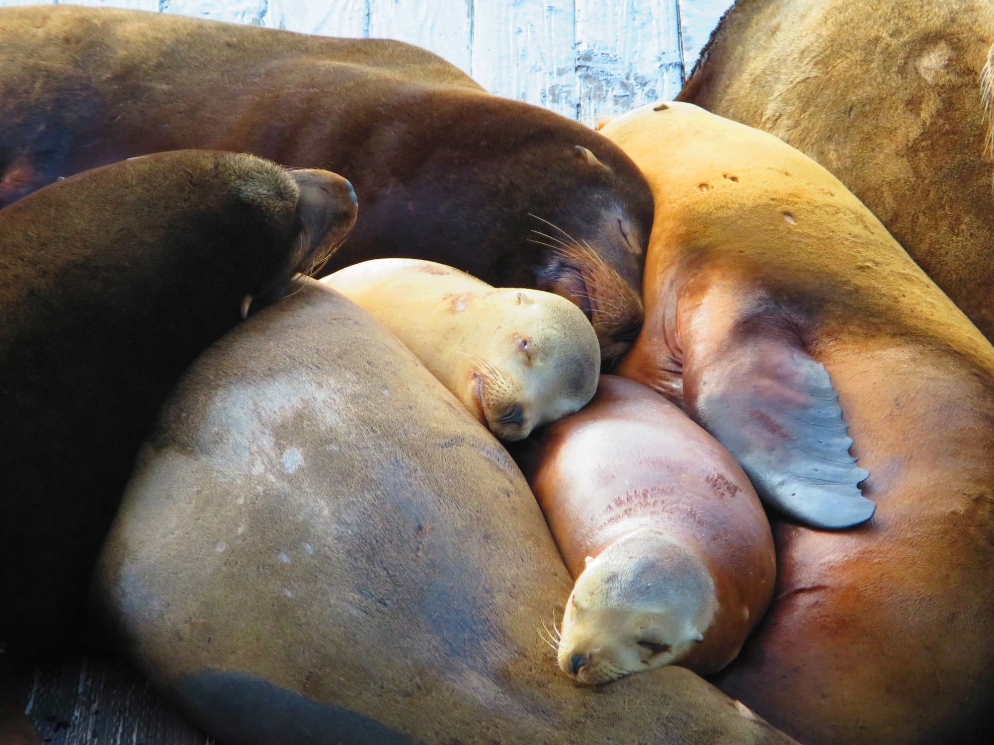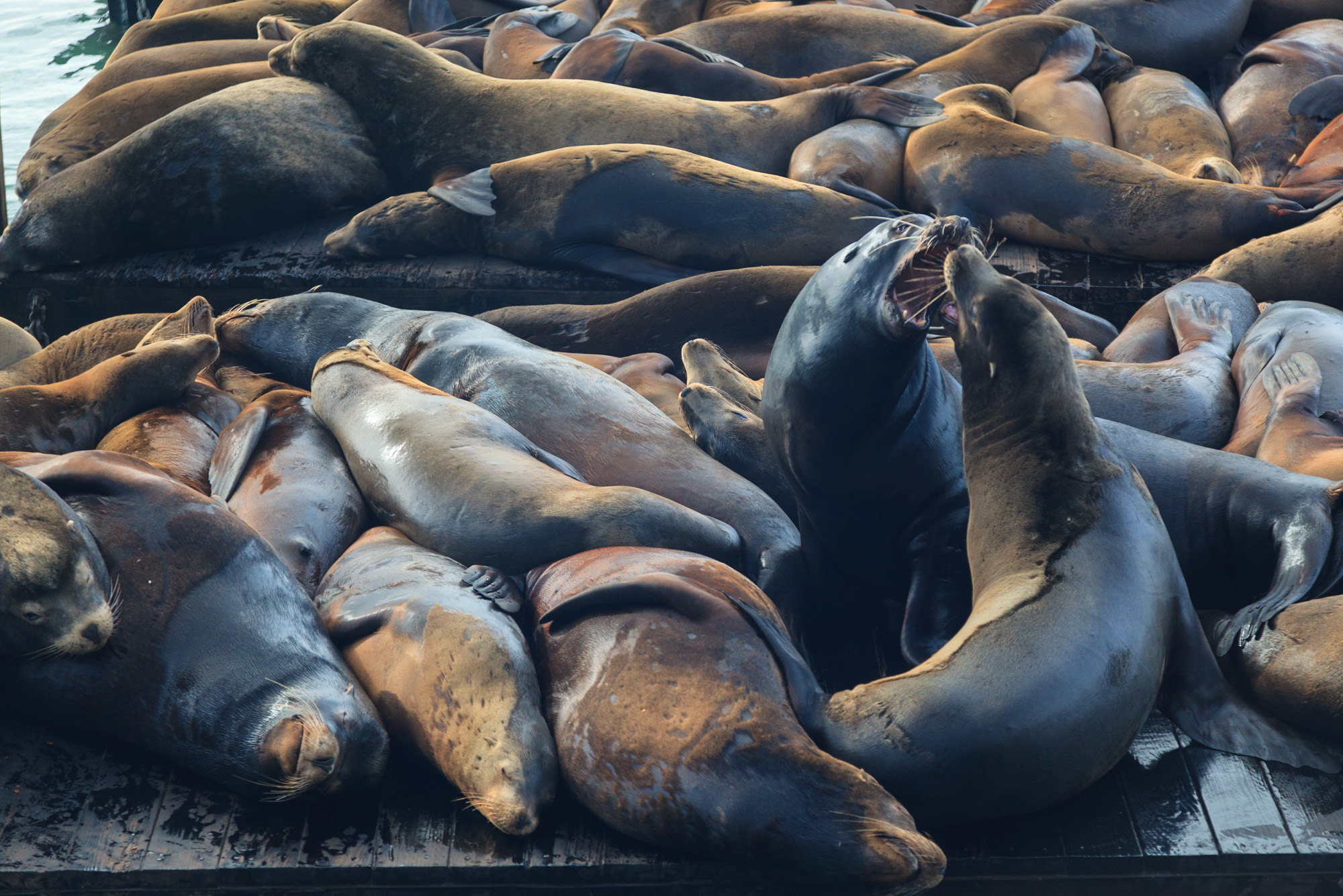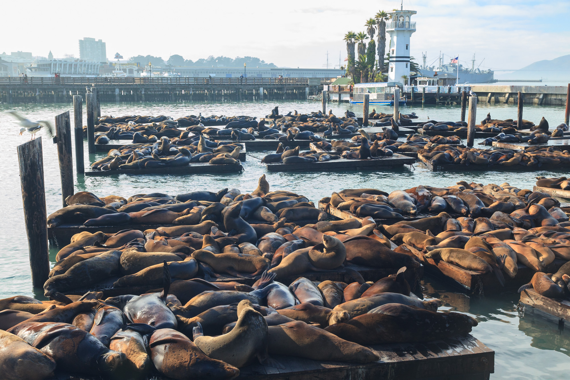 Au niveau du quai 39, une colonie de lions de mer s’est définitivement installée dans l’enceinte du port. A l’origine posée sur les digues, la colonie s’est déplacée sur des plateformes en bois que la municipalité de San Francisco a installées à cet effet. En arrivant sur le ponton qui surplombe les plateformes à lions de mer, on est d’abord assailli par l’odeur: un mélange de cuir rance et d’algues en décomposition. Nous effectuons un recensement rapide: on évalue à 1200 le nombre de bêtes.
