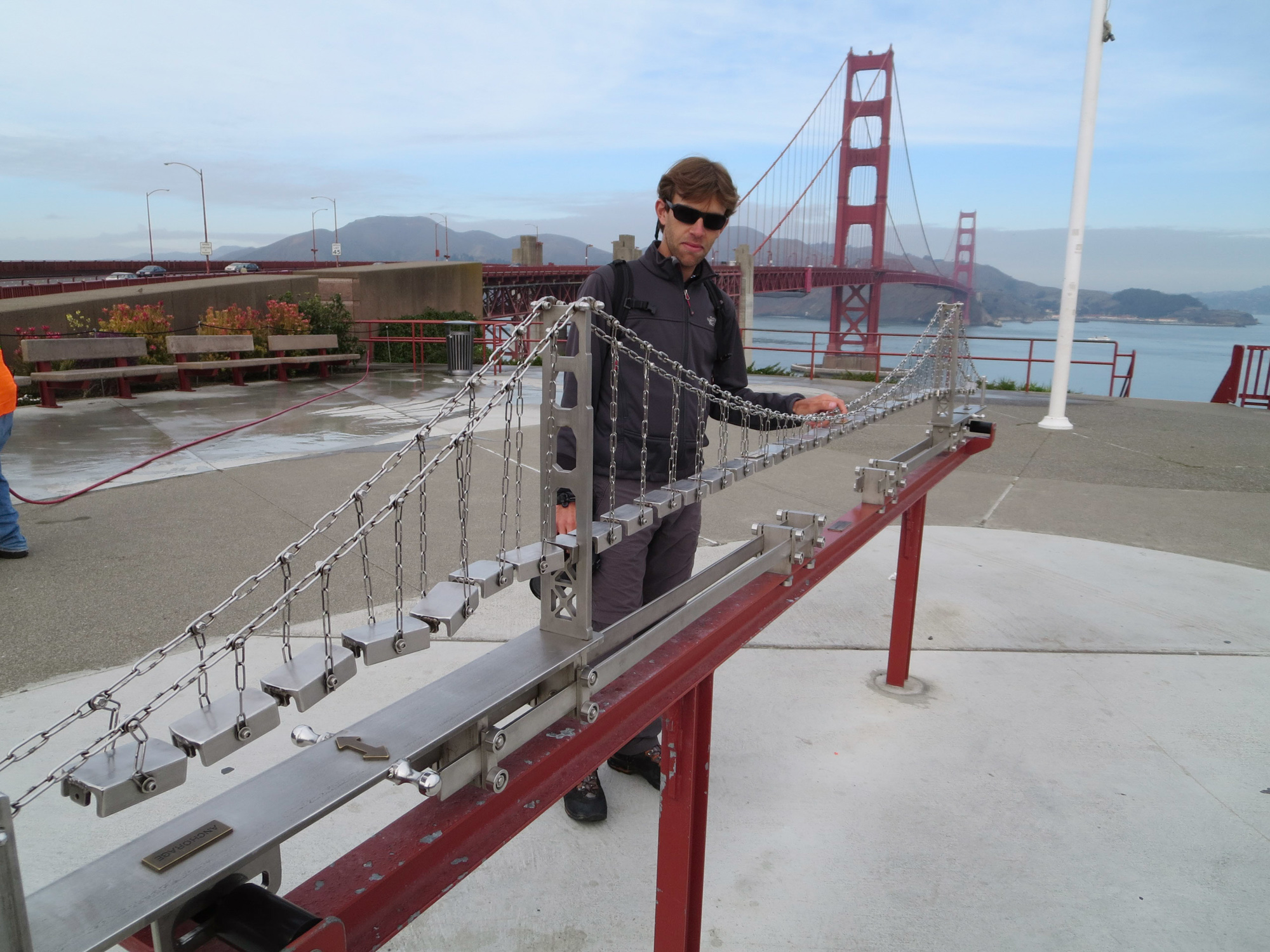 Sa structure flexible a été conçue pour pouvoir résister aux vrillages provoquées par le vent, la tension causée par le poids des voitures et camions et les contorsions engendrées par les séismes. Ces derniers sont la bête noire de la ville. Située sur la même faille que Los Angeles, San Francisco attend sans impatience “The Big One”. Une maquette permet de recréer les différents mouvements qui peuvent affecter le pont. Tel un Dieu malveillant, nous affligeons des secousses du diable à la pauvre maquette.