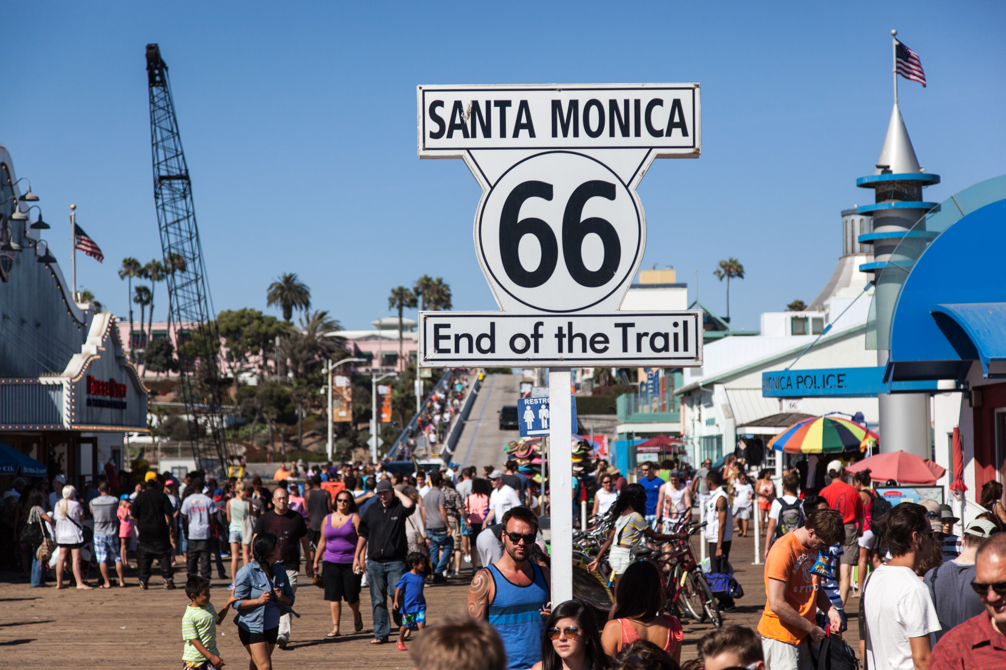 Sur la plage, il y a une immense jetée avec parking, fête foraine (grande roue, free fall…), café et boutique de souvenir. C‘est évidemment un lieu très animé. Cette avancée sur le Pacifique est officiellement la fin de la mythique Route 66 qui part de Chicago et traverse en diagonale les Etats-Unis. A faire de préférence en Harley Davidson avec un look à la Mad Max.