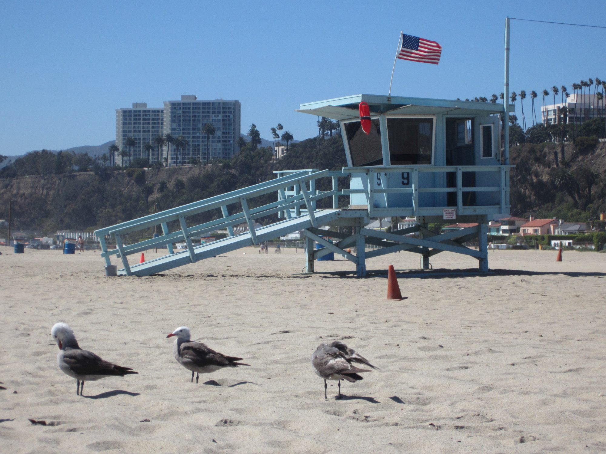 La raison d‘être d’un touriste est de confirmer les images préconçues qu’il a sur un lieu. C’est sur la promenade du front de mer et la plage de Santa Monica que nous venons en pèlerinage pour confronter nos clichés et la réalité. Je regrette de ne pas avoir de maillot de bain rouge pour courir sur la plage telle Pamela Anderson dans Alerte à Malibu (Malibu qui est d‘ailleurs a un jet de pierre de là). Les sauveteurs en mer sont bien dans leur cabanes caractéristiques avec leurs flotteur rouges, prêts a intervenir (et à vous faire du bouche à bouche).