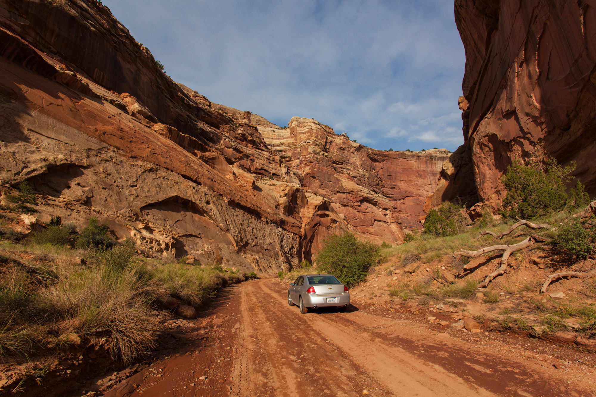 Les différents itinéraires de Capitol Reef nous permettent d’explorer au plus près les formations rocheuses colorées: une piste nous mène au coeur des falaises, hautes de dizaines de mètres mais ne laissant qu’un étroit passage aux lits des rivières, secs ce jour-là. Ces lits de rivières ne sont qu’occasionnellement alimentés par l’écoulement des eaux lors des orages: revoilà les flash floods ! Au milieu de ces défilés rocheux, il suffit de regarder les formes creusées dans la roche pour se faire une idée de la façon dont la rivière attaque les parois: intérieur des méandres aux formes arrondis, extérieur brutalement frappé par la puissance des flots.