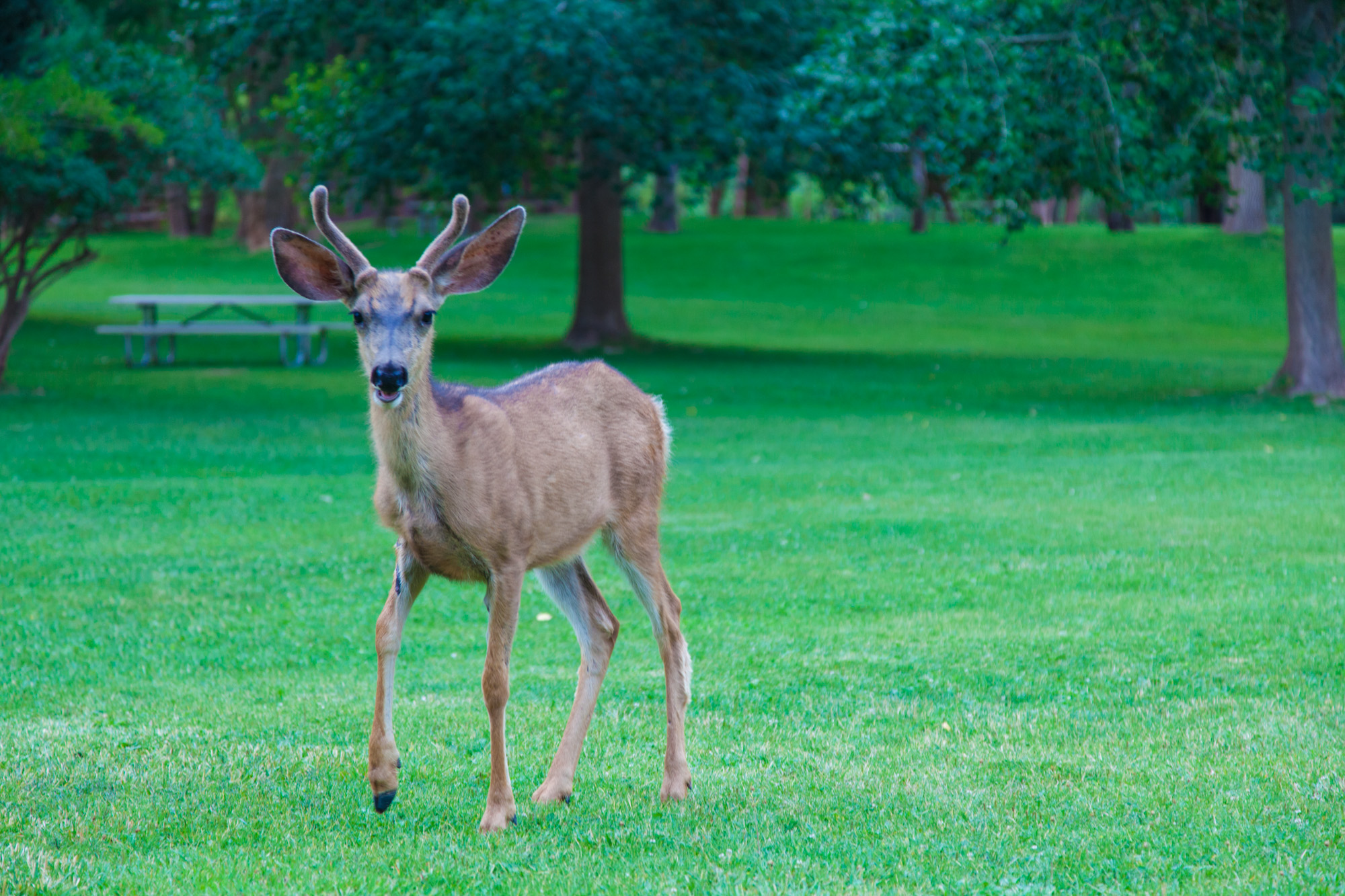 C’est au milieu des pelouses du campground que nous montons notre tente. De l’herbe sous les pieds nus, il y a longtemps que ça ne nous était pas arrivé !