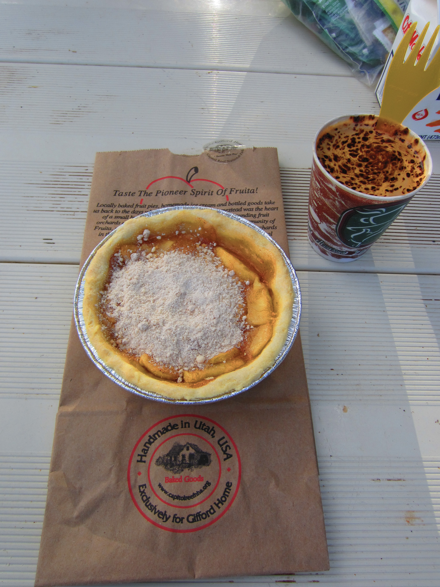 Au milieu de l’aridité du paysage a été préservé un véritable oasis de verdure, le long d’une rivière alimentée tout au long de l’année - une ressource rare dans ces grandes étendues désertiques. Des colons mormons s’y installèrent dans les années 1880 et y firent prospérer un gigantesque verger qui a subsisté. Au Visitor Center, le film de présentation du park délaye allègrement sur les valeurs de cette communauté mormone: attachement à la terre, solidarité… on s’attendrait presque à voir Charles Ingalls apparaitre et jouer du violon. Il reste aussi de cette époque une minuscule école, une petite maison transformée en musée et une spécialité de tarte aux fruits du verger à laquelle nous avons, bien évidemment, fait honneur.
