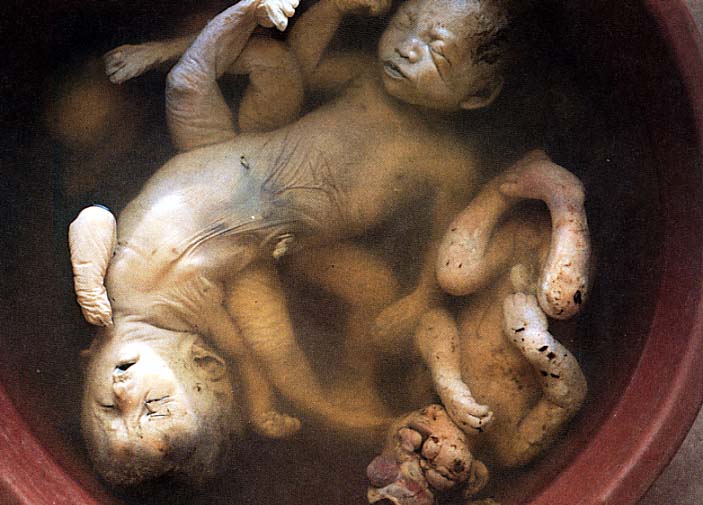 Des photos prises dans des hôpitaux, des orphelinats et des familles montrent des bambins nés sans bras, ou sans jambes, ou encore sans orifices globulaires. D’autres ont vu le jour avec des crânes énormes. Une légende indique que ces photos ont été prises quelques jours avant la mort des sujets photographiés. Des journalistes retournés à intervalles réguliers sur des zones contaminées témoignent, clichés à l’appui, de la vitesse avec laquelle la santé des habitants s’est détériorée, en particulier celles des enfants: développement stoppé, dégénérescence nerveuses, paralysie…