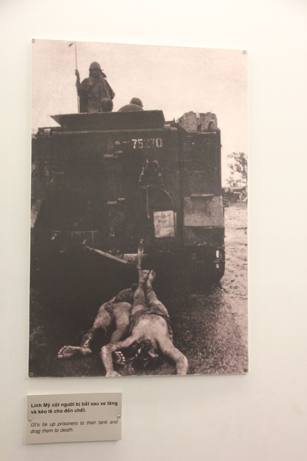 Les salles suivantes sont, en effet, consacrées aux atrocités commises par l’armée américaine sur la population vietnamienne. On peut y voir des clichés d’exécutions arbitraires de familles entières, des cadavres disloqués de combattants Viêt-Cong exhibés par des soldats américains hilares, un supplicié trainé par un char américain dans les rues devant les objectifs des photographes de guerre…
