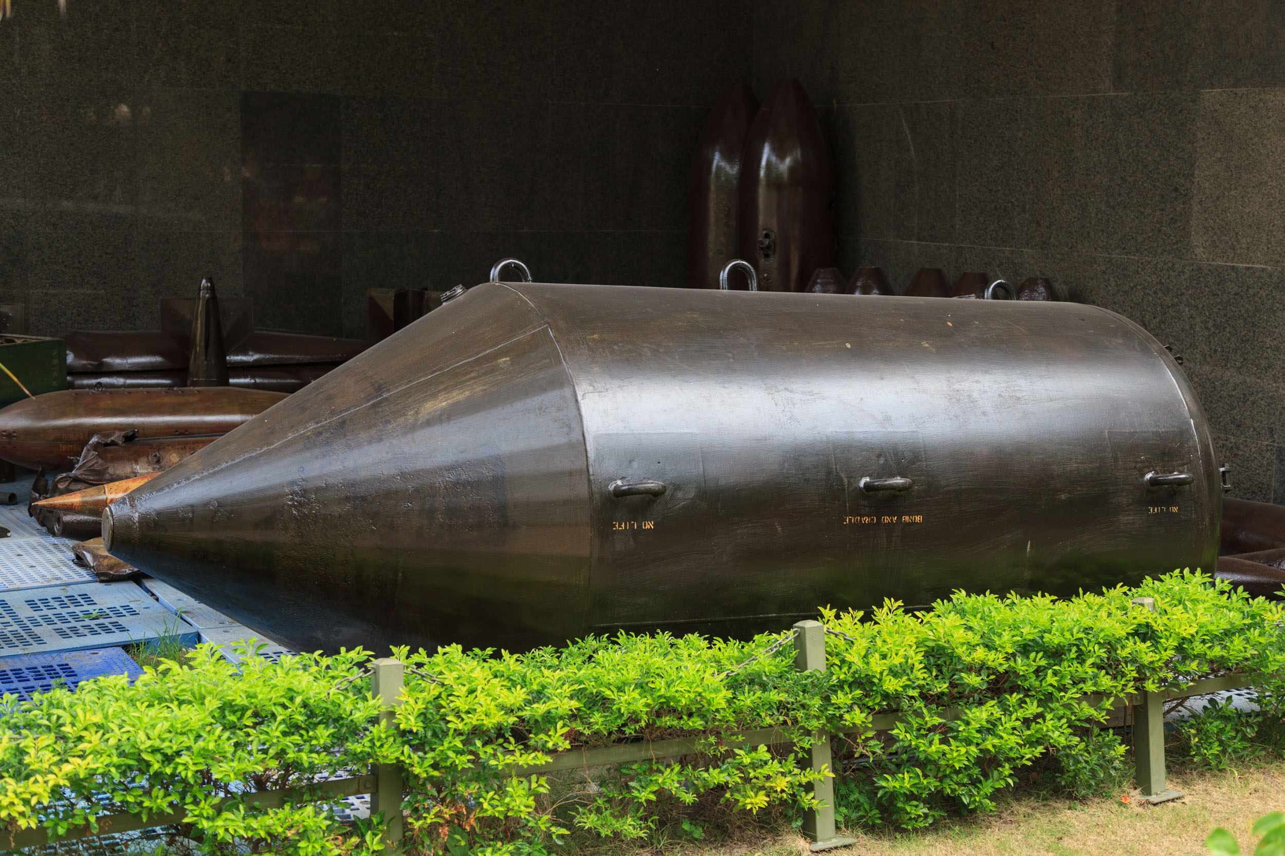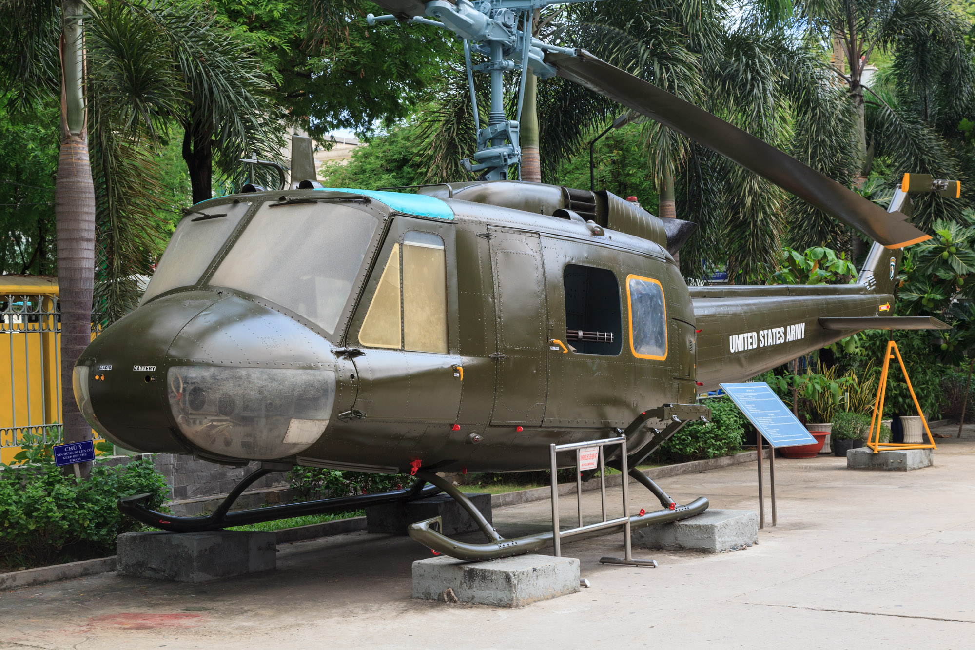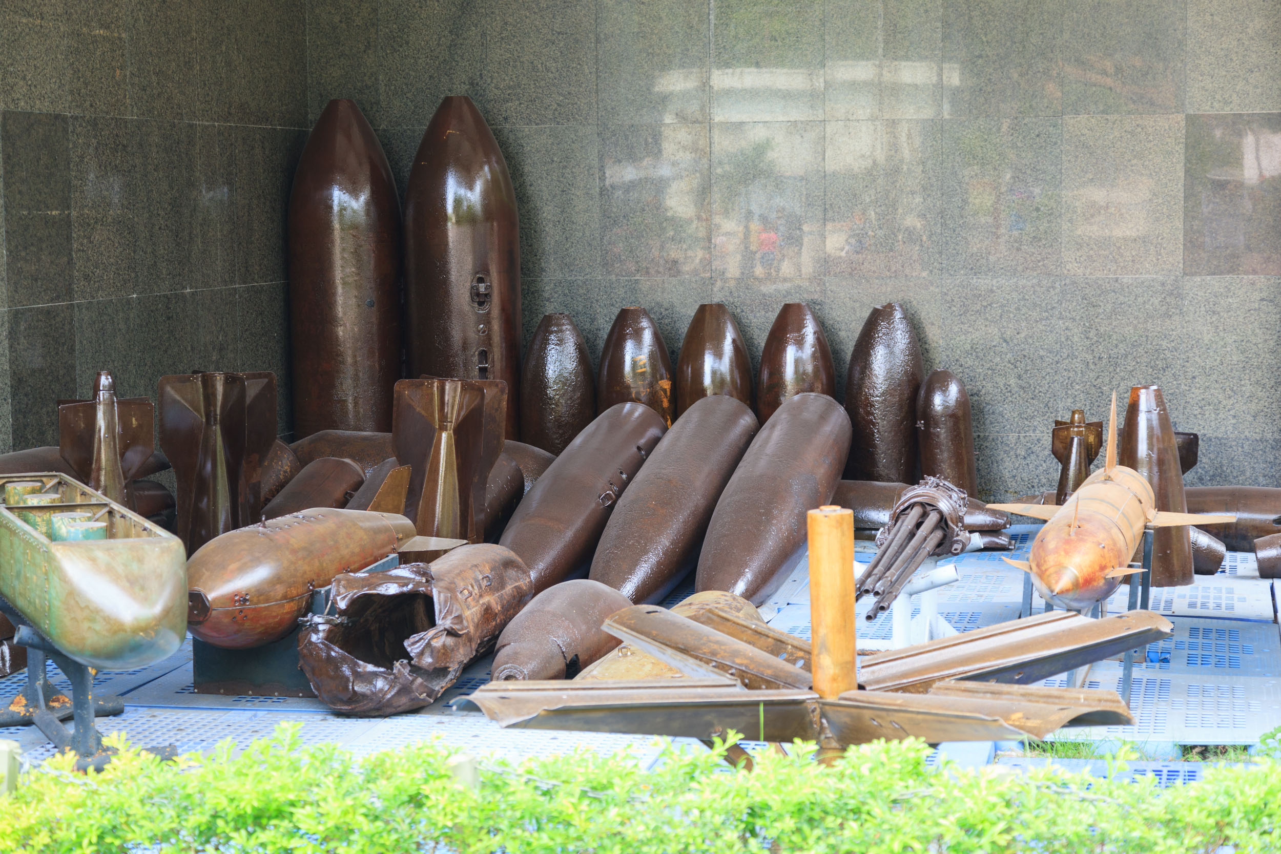On rentre d’abord dans une cours où sont exposés les fleurons de l’armement américain: hélicoptère Chinook, avion de combat F4… on se croirait dans Apocalypse Now. Nous pouvons aussi observer le nec plus ultra des bombes de l’époque.