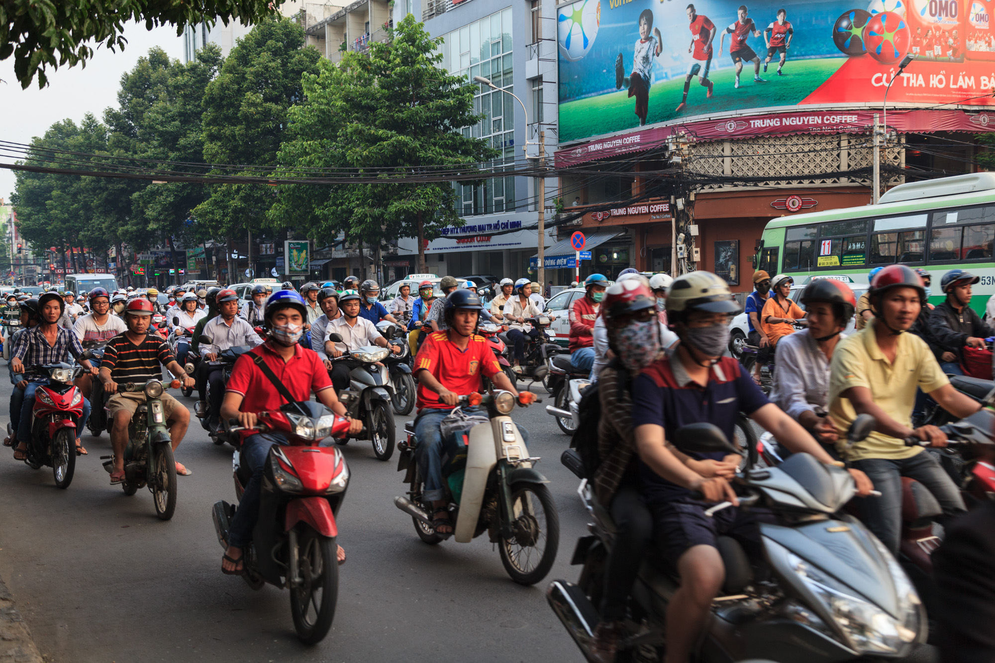 Ce qui nous marque le plus dans l’ex-Saigon, c’est la circulation des deux-roues. Elle est démentielle: des millions de motos emportent des solos, des duos, des trios et parfois des familles entières. Sans compter les chargements plus ou moins insolites d’animaux, de matériaux de construction ou de courses diverses. Aussi, il faut acquérir très rapidement une bonne technique pour traverser les rues. Elles consiste à suivre l’exemple des locaux qui s’engagent sur la voie, peu importe l’ampleur du trafic, et qui marchent d’un pas régulier et déterminé en évitant les arrêts brusques et les changements de direction inopinés. Les motos vous contournent ainsi sans problème.