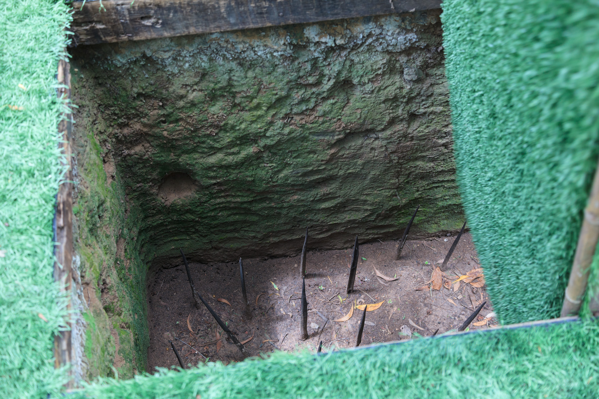 Le guide commence par nous donner un aperçu des pièges tendus par les Viêt-Cong aux soldats américains. Des piques de bois empoisonnées cachées sous un pan de sol mobile, des sortes de piège à loup cachés sous la végétation, des herses affutées tombant sur les visiteurs à l’ouverture de la porte d’entrée… de quoi refréner toute envie d’exploration.