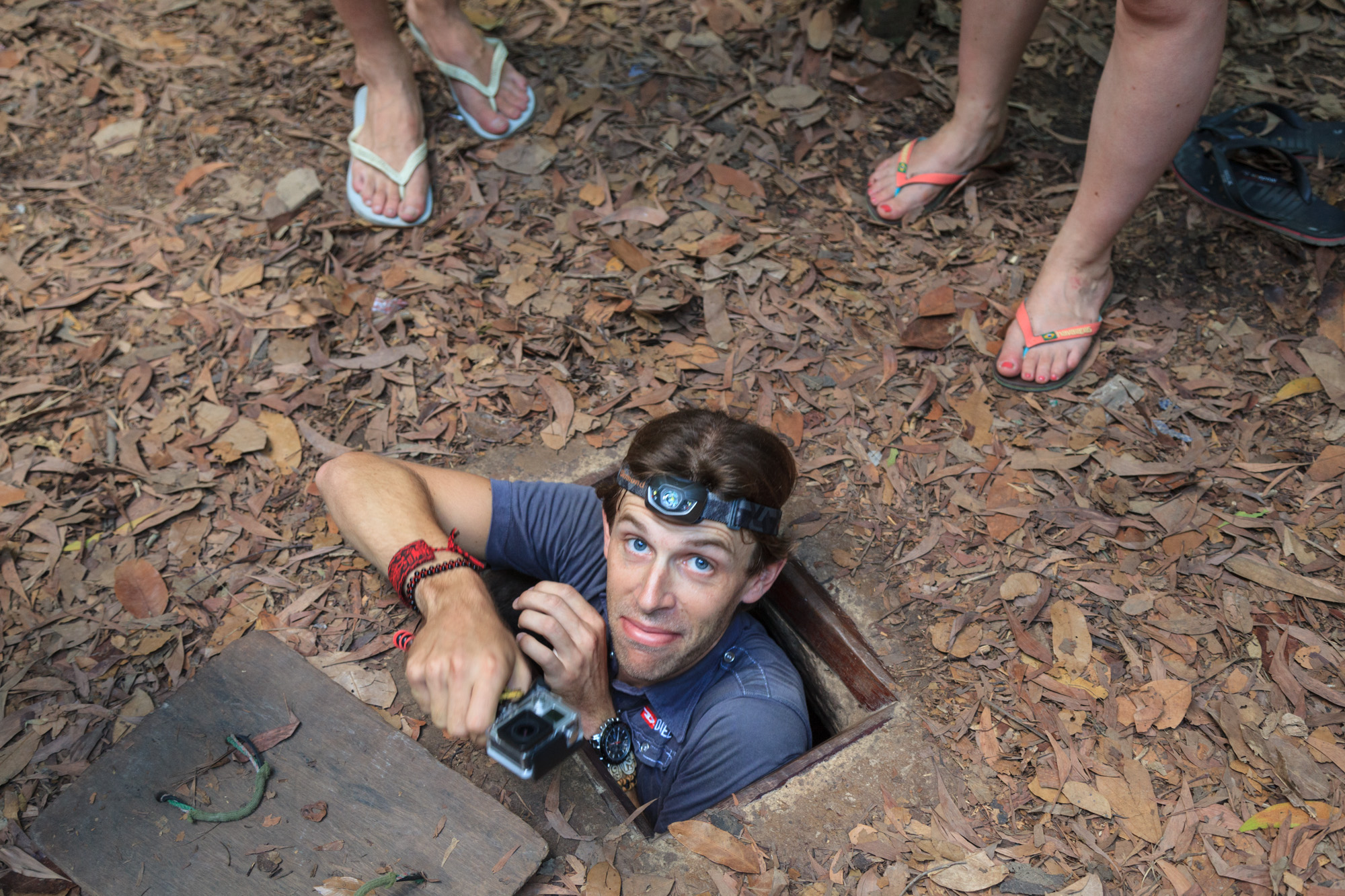 Nous nous groupons enfin autour d’une petite trappe: une entrée de tunnel. Nous sommes invités à y pénétrer avec une lampe de poche et à parcourir quelques dizaines de mètres. Nous faisons nos adieux à ceux restés à la surface et plongeons dans les entrailles de la terre.