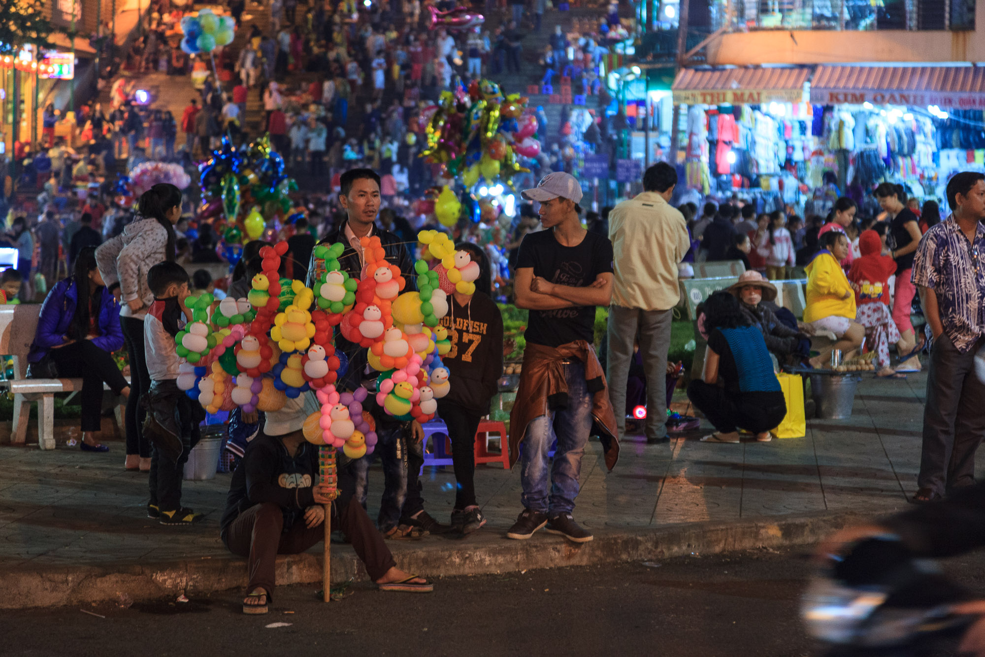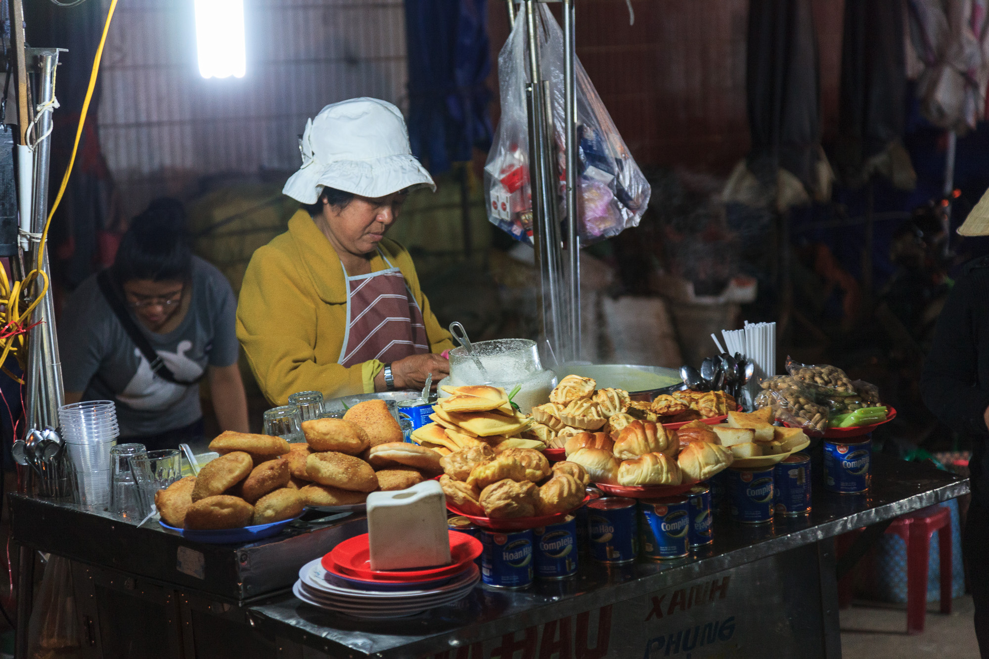 Le climat y est, en effet, plus sec et plus frais et il n’est pas rare de croiser des Vietnamiens emmitouflés dans des blousons, avec écharpes en laine et bonnets. Conséquence: on peut trouver au Vietnam des chandails, des pulls et des articles en laine sur les étals si si, ca vous en bouche un coin, hein ? Les gargotes propose des plats roboratifs et toute une gammes de gâteaux (brioches, beignets, gaufres…) servis chauds avec une sauce à la vanille brûlante. Bref, on se croirait presque sur un marché de Noel.
