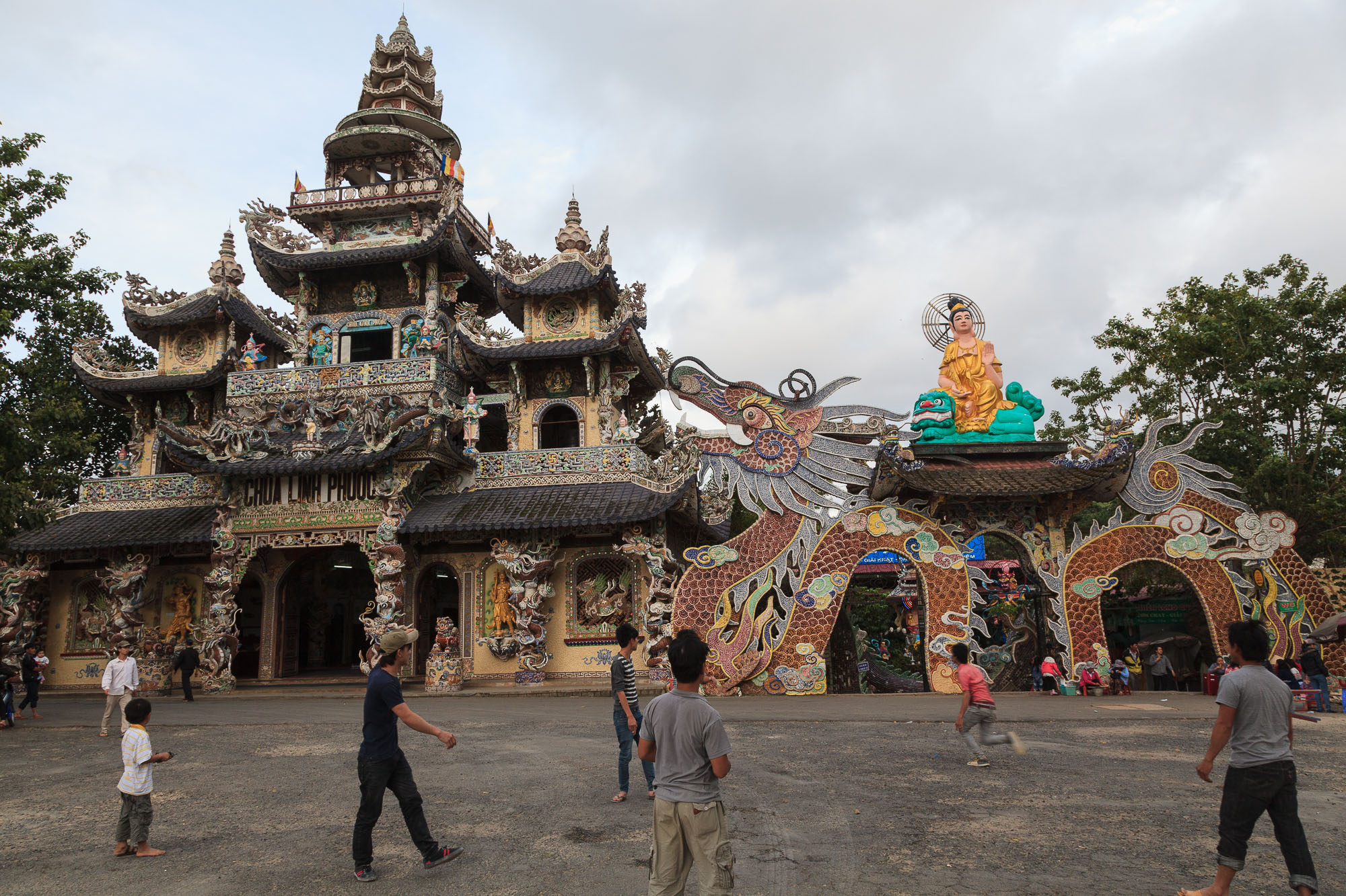 Nous passons ensuite par la pagode de Linh Phuoc: un temple complètement fou recouvert de tessons de bouteilles et de bris de porcelaine. Ca fait un peu penser à du Gaudi mais en version asiatique. Kitsch à souhait!